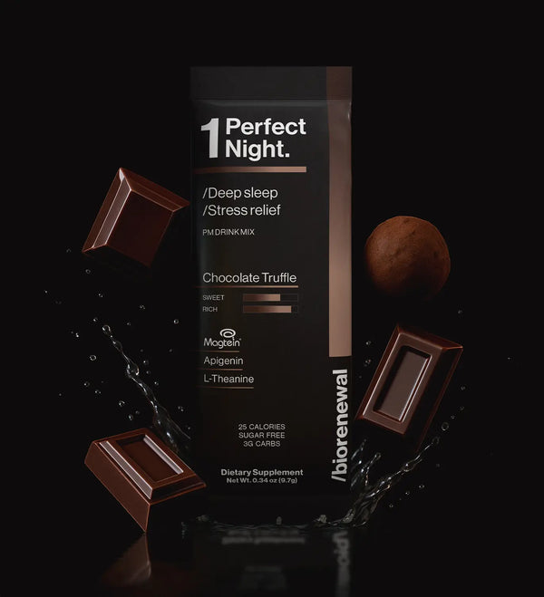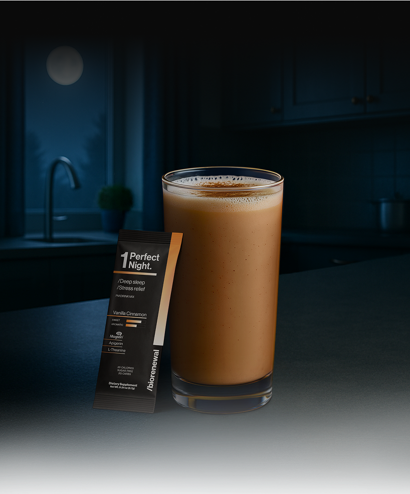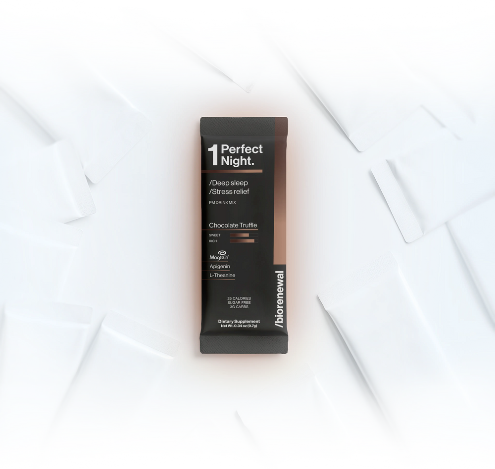 One Perfect Night (PM supplement) helps you wind down for sleep. It's formulated to promote deep sleep, stress relief, and overnight renewal, making it integral to your evening protocol.